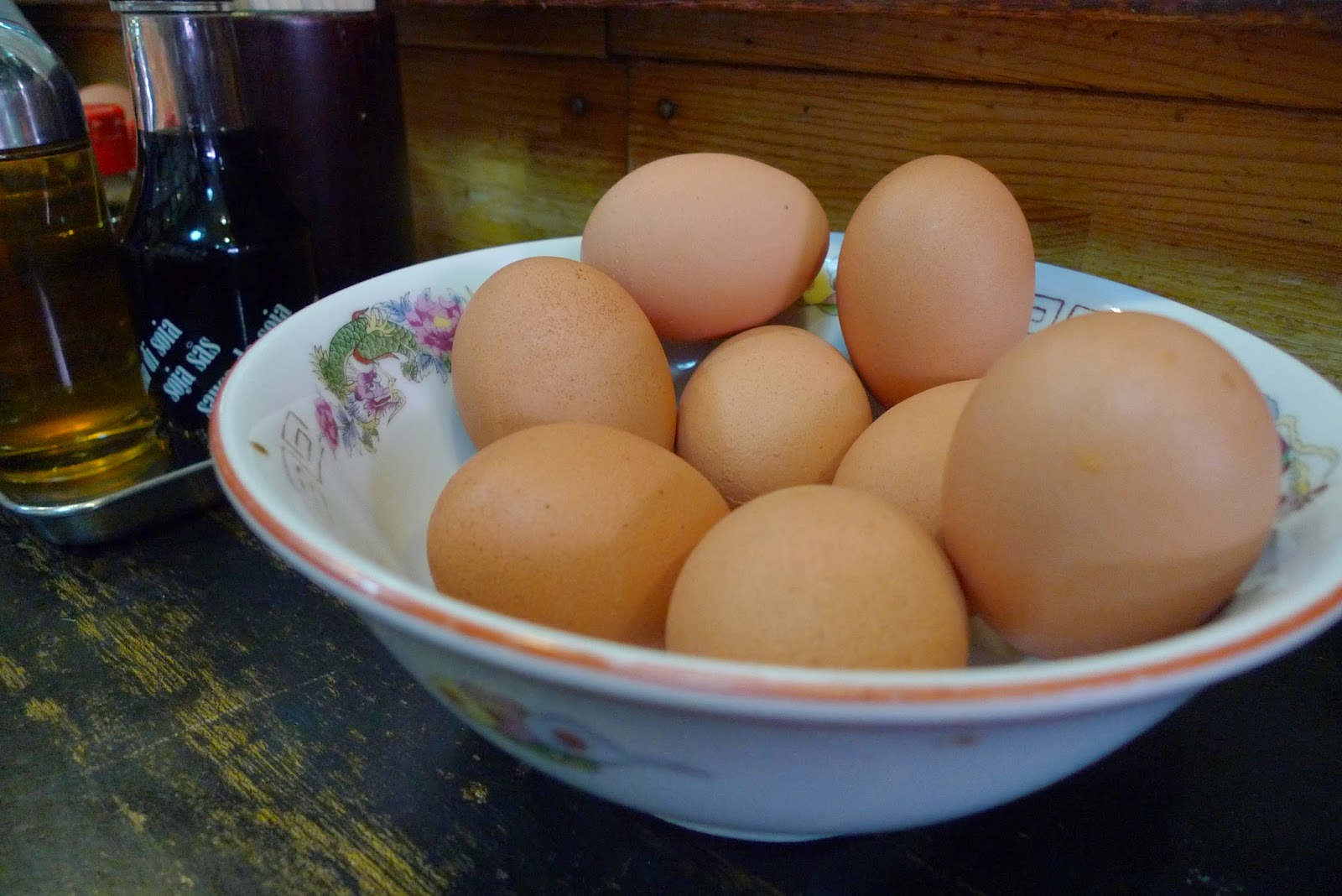 (食べ終わってお皿に残った味噌に、卓上の生卵を入れ、溶いた皿に